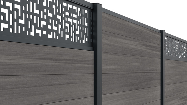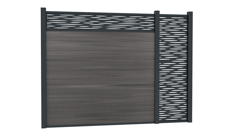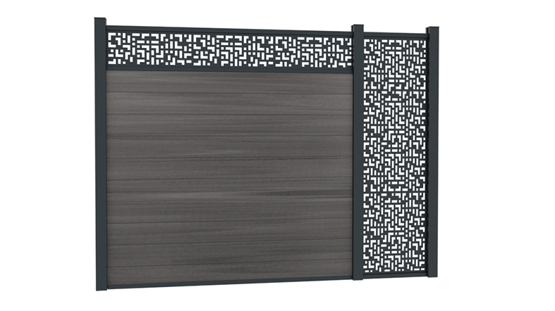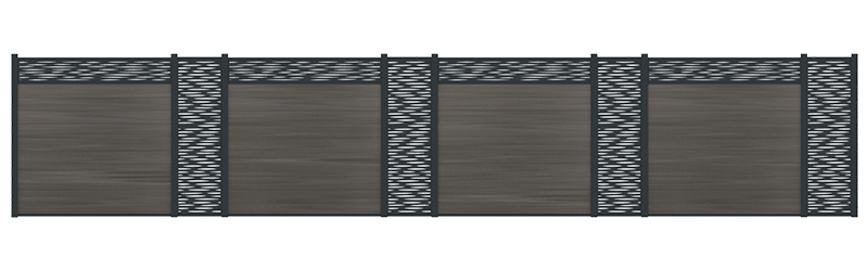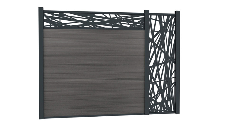 Atrévase a añadir un toque de modernidad con la decoración Héra. Las líneas de cebra son contemporáneas y aportan un estilo único. Las decoraciones vienen con un marco de aluminio ranurado que encaja perfectamente sobre las lamas de aluminio o composite y en los rebajes de los postes.